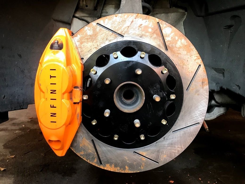 Excuse the rust, the fronts sat a couple of day while I was trying to figure out teh rear rotor situation. This pictures is with the Q60 rotor hat. Everything bolts up fine except the parking brakes won't make contact.