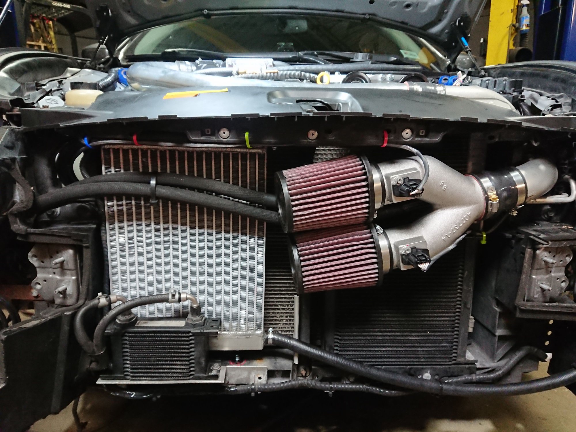 24hrs worth of labor later the supercharger is in. Thank goodness I did it on my own otherwise the total cost would have been painful. Most of my install time was spent test fitting and figuring out the best routing for all the tubes, piping, and wiring. There was a lot of deviation from the instructions but nothing that would impact the operation of the kit. The instructions claim that some things are pre-assembled, like the bypass valve, but that's far from accurate. All the tubing had to be cut to fit so that there is clearance. There was some triming of the air diverter that needed to be done to fit the heat exchanger and charge pipe.