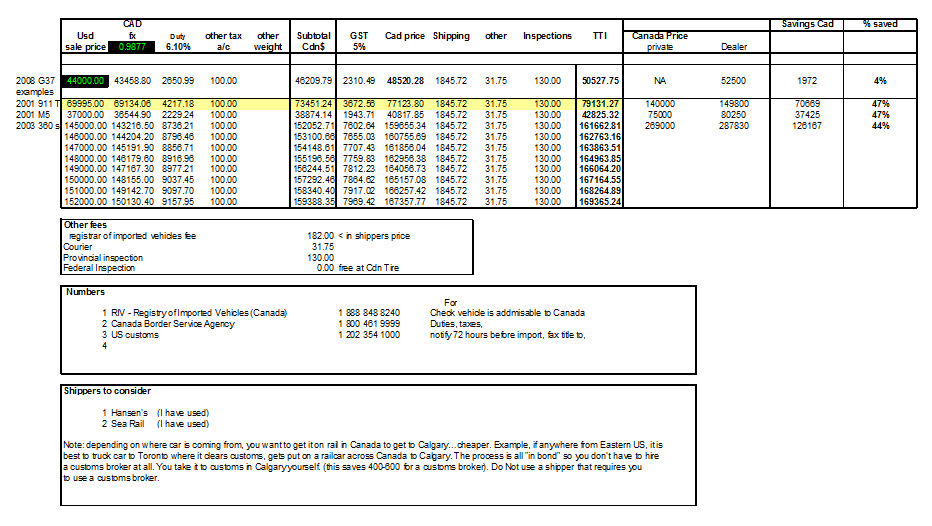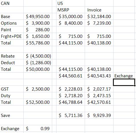 The attached shows a closer comparison to what you can expect and is an apples to apples comparison. The options line brings both cars up to the same options; then we figure out exchange rate conveison, then taxes, the differences.