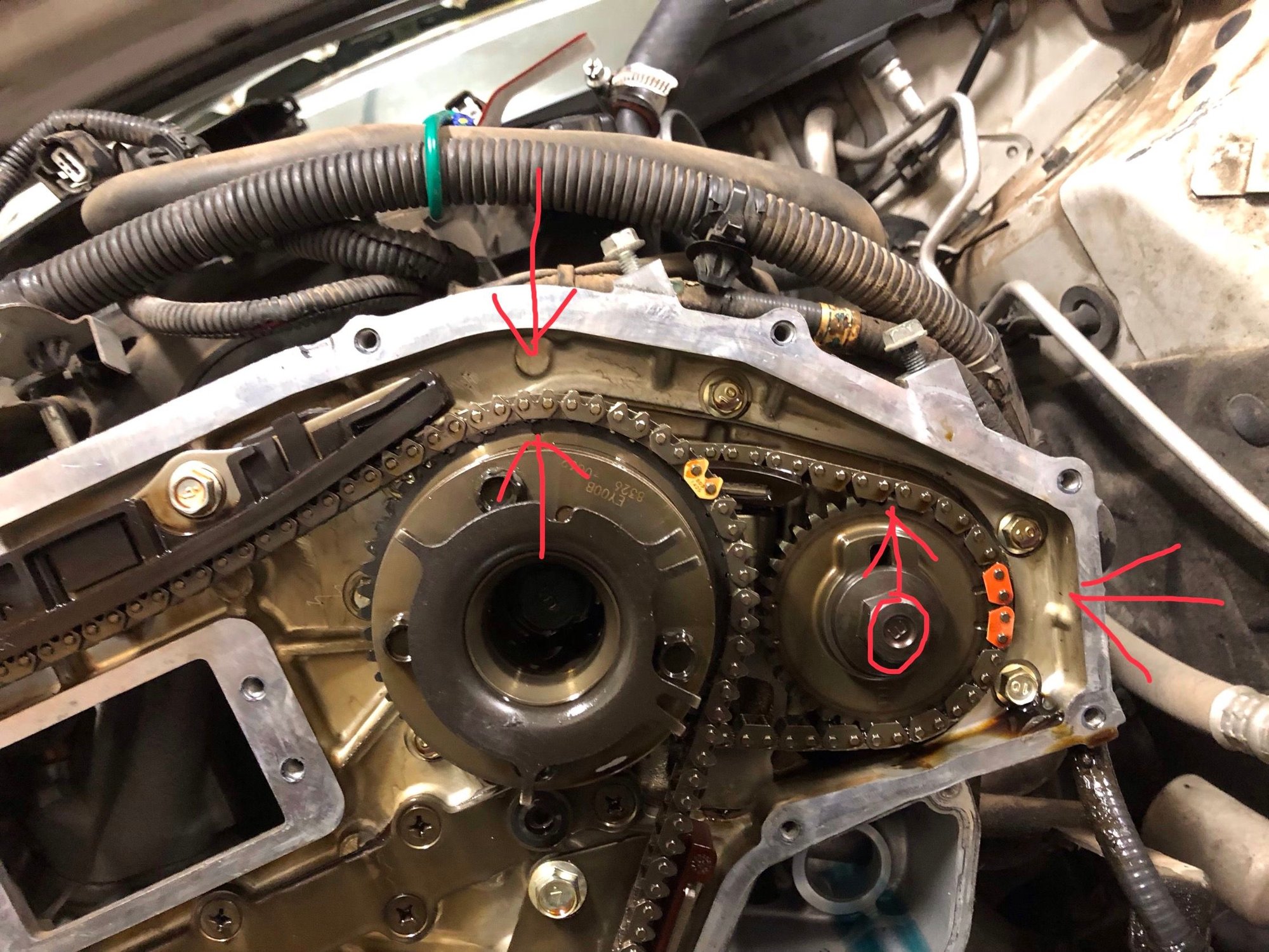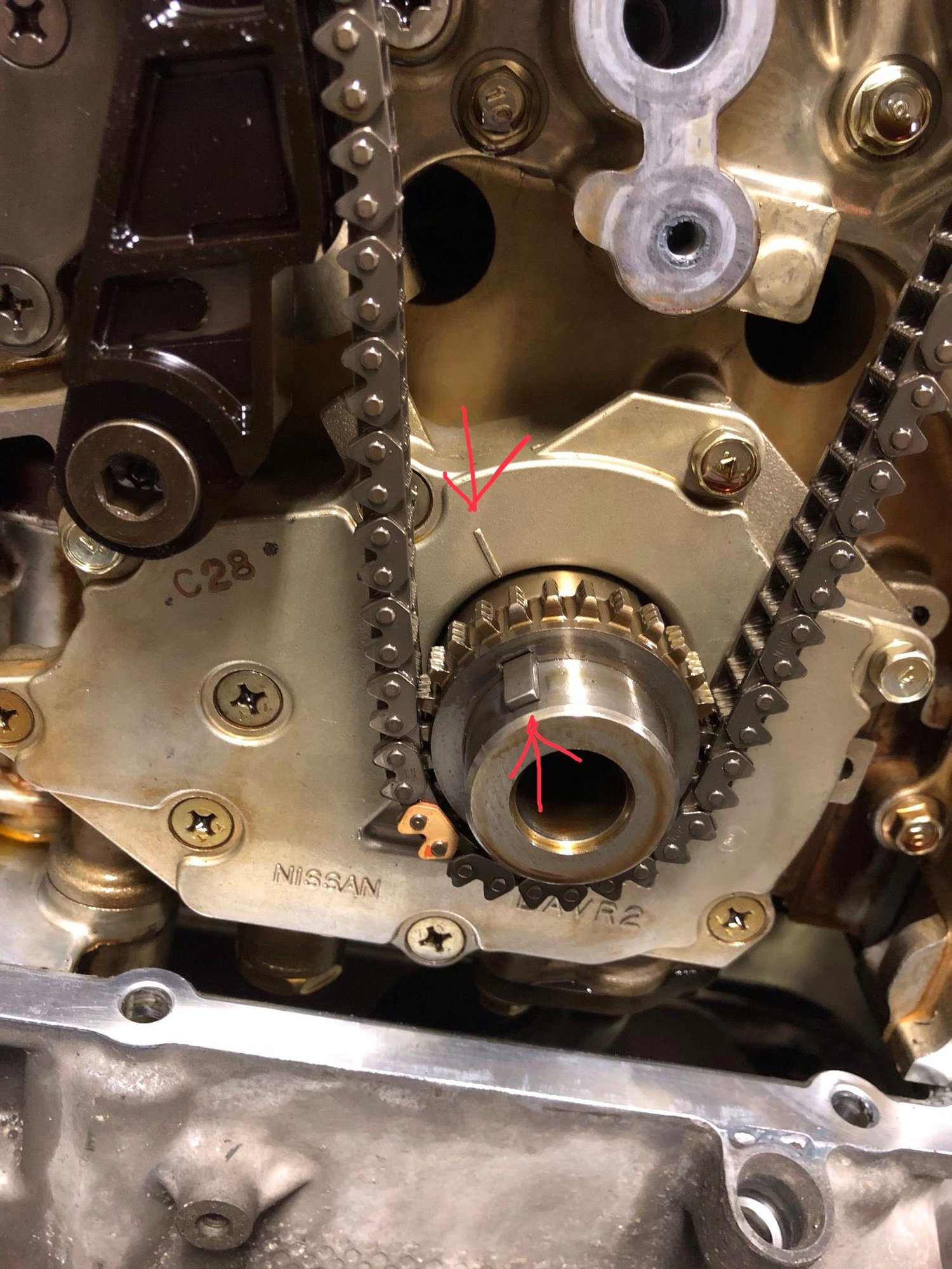 question though, what are the arrows you put on the picture with the cam chains lining up with where the orange chain links are? ...I dont see any marking on the rear cover on those sides? Am i missing something (i'm sure its in the FSM but real pics like the ones you posted are so much easier to work off)