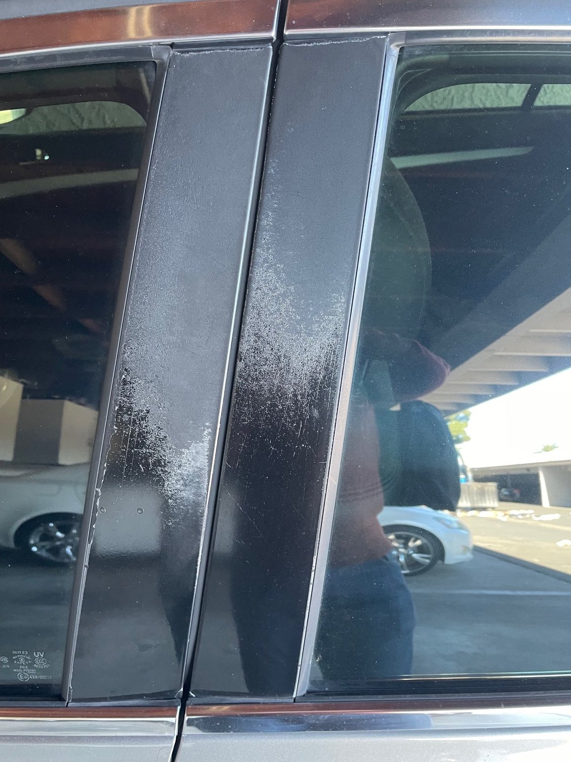 Here is what the pillar posts looked like before applying the vinyl. On the passenger side, one post was in decent condition while the other had lost its clear coat and was a mess - a good indication that the something was wrong with the clear coat coming out of the factory.