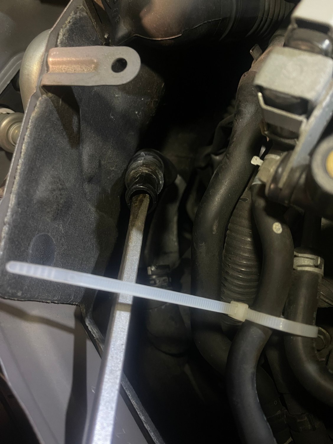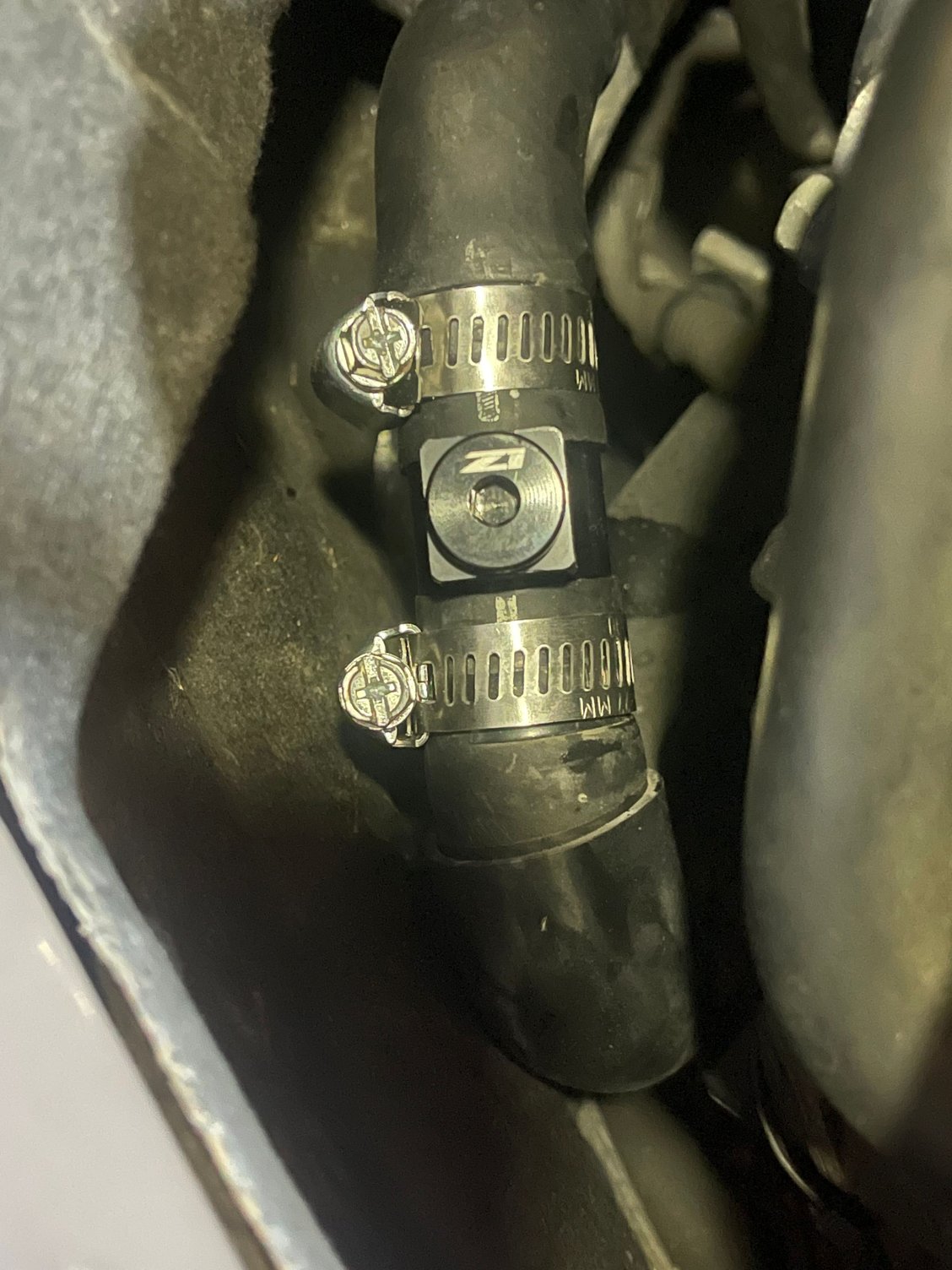 8: After both sides are tightened, Remove zip tie from the hose you installed earlier, Replace all trim peices in the opposite order you removed them in (make sure all your clips go back in and also weather stripping is properly snugged). And admire. 9: Once fully reinstalled. Start your car and make sure no coolant is leaking out of the new connector. I drove mine around the block once, checked the connector, then rang it out a little bit on a long road. No coolant leaks here! If any coolant leaks out or your coolant reservoir is low, top it off before you drive.