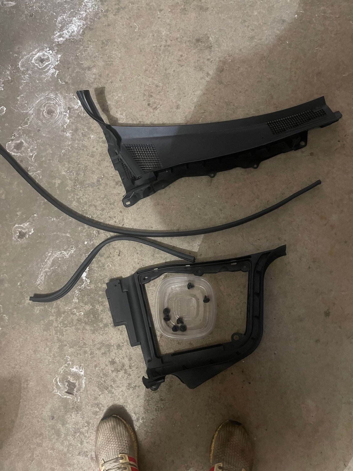 2: Remove Battery Cover (passenger side), Strut bar (if applicable and in the way), Small S shaped weather stripping on passenger side, long weather stripping along top of engine bay, battery shroud (few clips easily visible), and the shroud right under windshield above the cabin air filter (also a few clips)