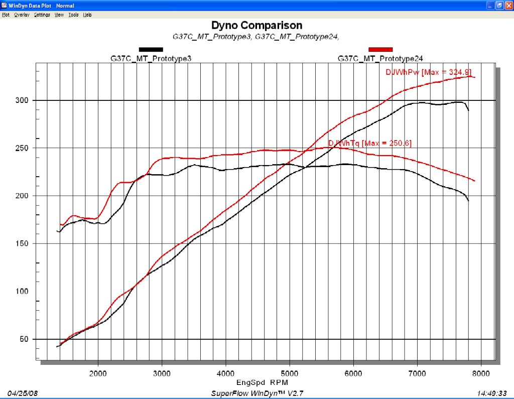 To all that may be interested, Technosquare just finished the Reflash for the G37Coupe MT Prototype car. The car came to us already with a prototype HKS Exhaust (which includes downpipe and mufflers), but stock cats, stock headers, and aftermarket intakes were installed.