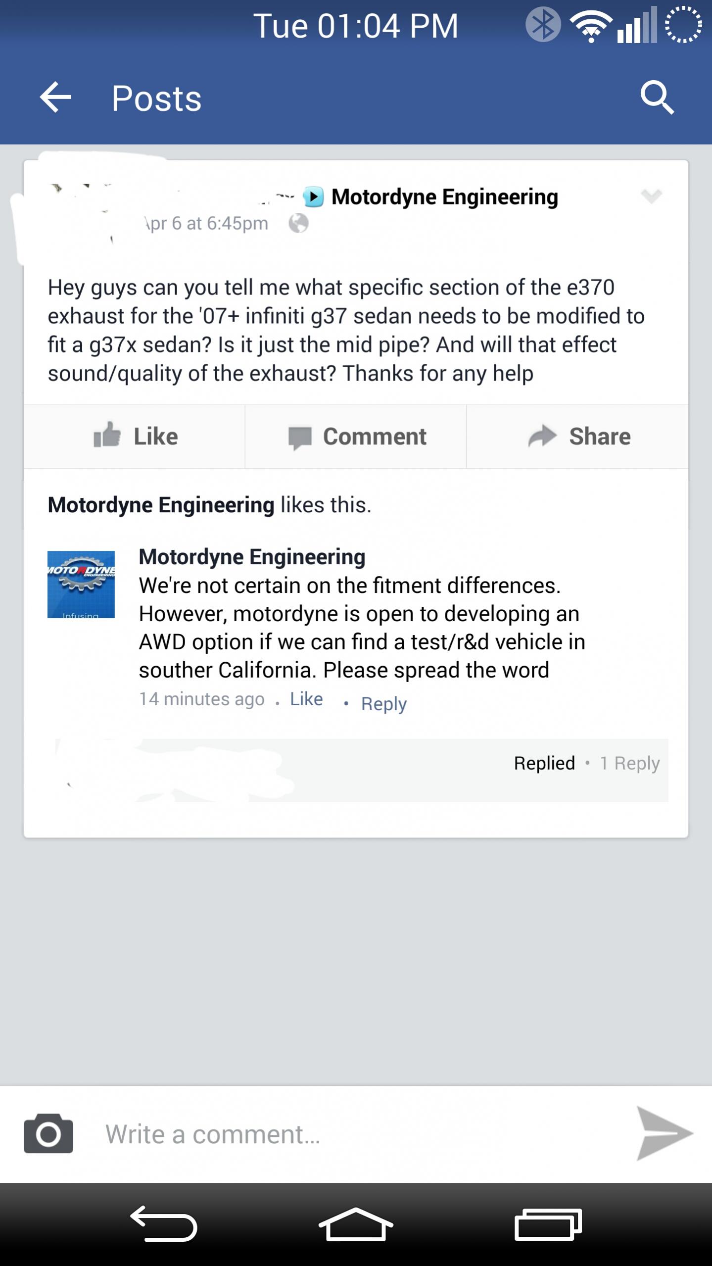 Hey guys I'm not really a double poster and forgive me for such but I'm trying to drum up attention for a really great opportunity for us AWD g sedan guys ( I know there aren't many lol) Anyways see the attached screenshot below, basically motordyne is looking for an AWD sedan for r&d to develop a shockwave exhaust for the Awd G!!! I started a thread but only looks so far and no posts so I can't really gauge if this is something people are not interested in or if it's just buried in the exhaust forum. So this being one of the more active sedan threads I figured I'd give it shot. I apologize in advance for double posting but it's the first confirmation I've seen that they (Motordyne) is willing to develop an awd exhaust!!!DOMO