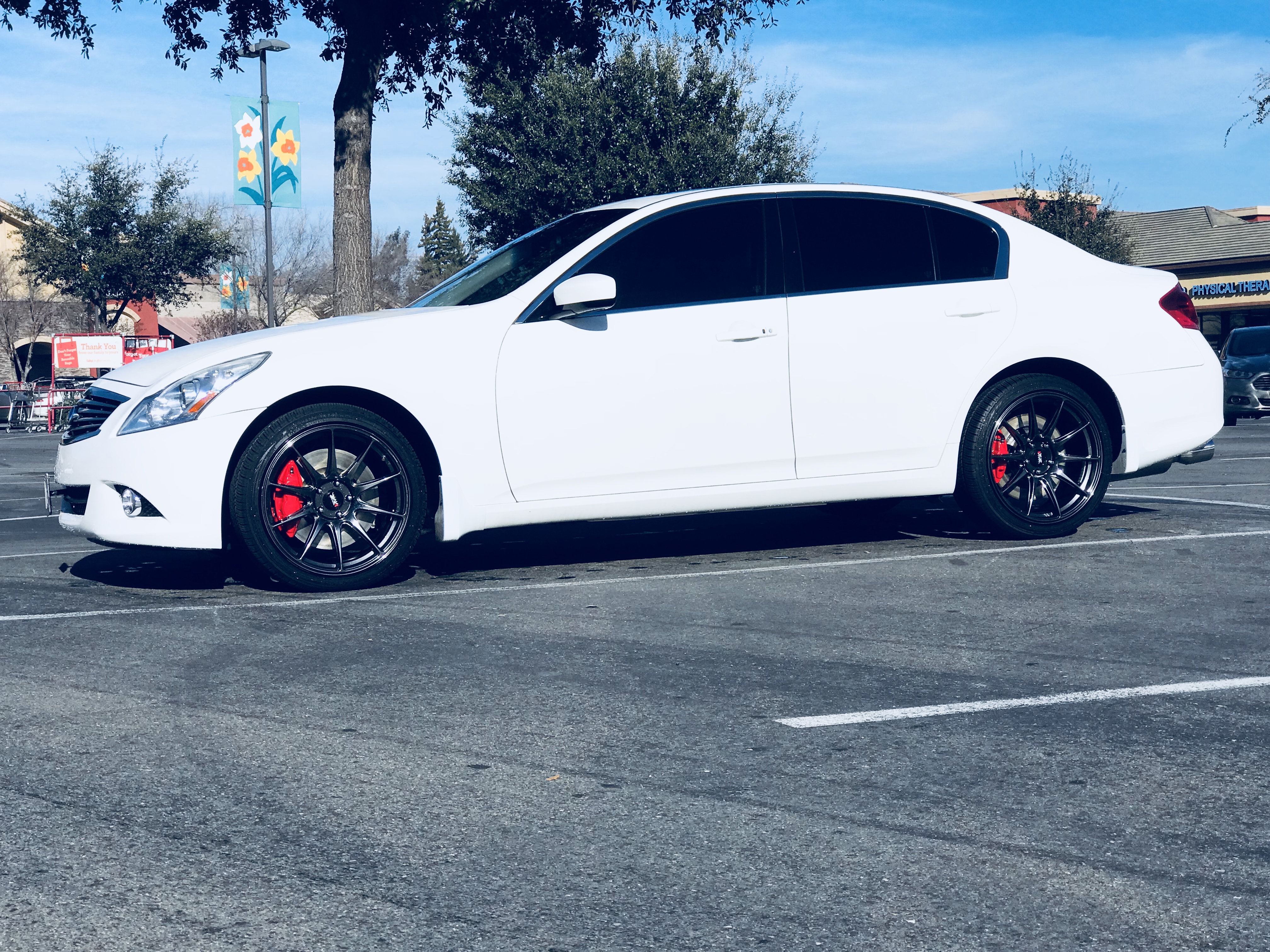 Decided to order these and install them. Took me forever since the bolts were so rusted, but loving the new calipers on my g37x sedan. Time to close the wheel gaps. Waiting for a good deal on swift springs