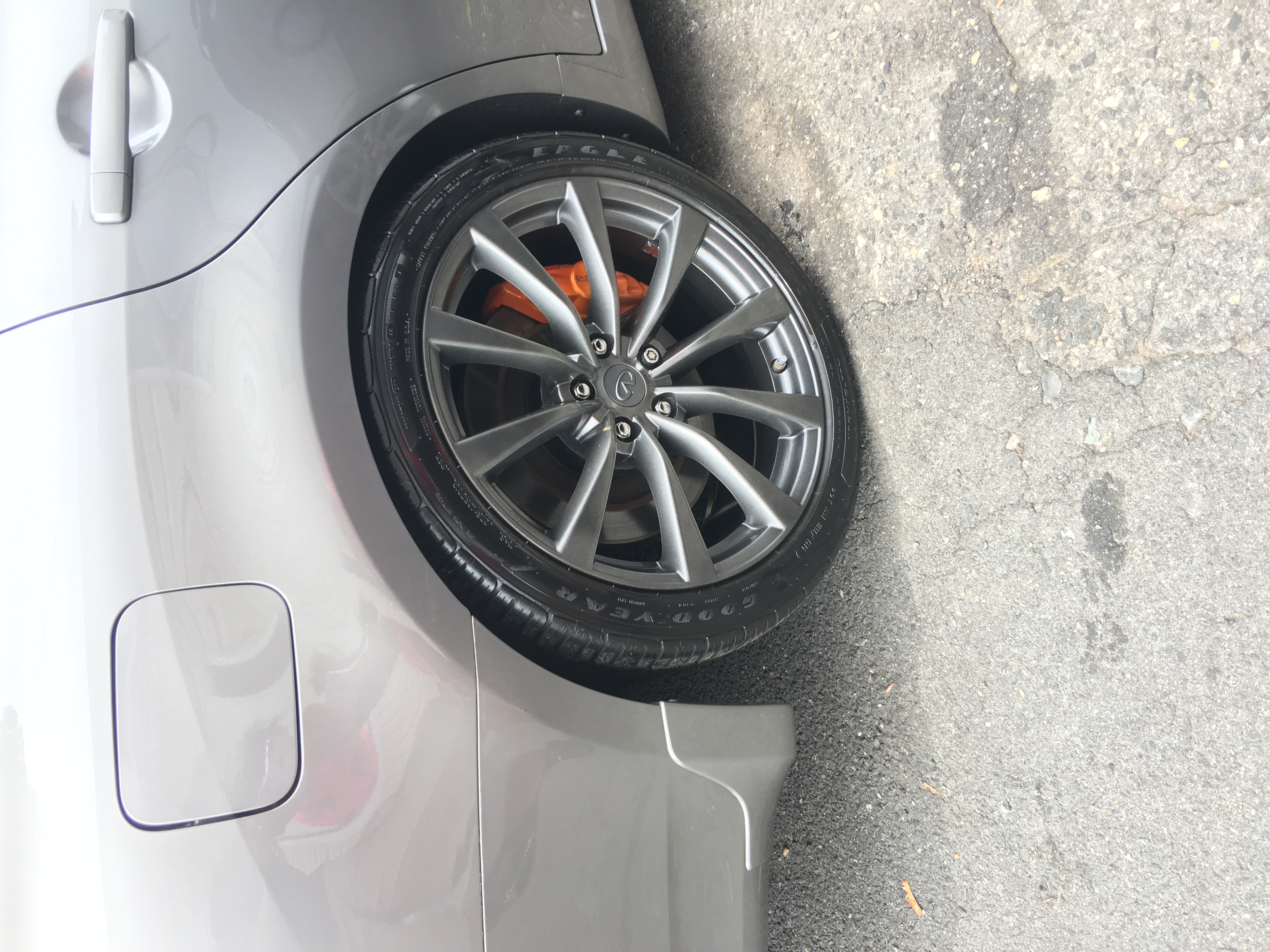 Here is a shot of the wheels that were refinished and powder coated Kingsport grey. To me it's not enough contrast to bring out the calipers. It's going back to gunmetal grey by Columbia coatings. Theirs is a very dark grey, almost black.