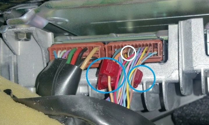 In this pic I've circled in white what looks like a severed signal wire. Infiniti uses balanced signals from the head unit to the amps. There is both a positive and a negative signal wire wrapped in a copper braid and plastic insulation. When the previous owner sold the car, He/She probably just cut the wires with knife or wire cutter. (I'll refrain from making judgements on the previous owner's skillset). The two red things circled in blue are wire taps. Using the service manual mentioned by SonicVQ above, you're going to have to trace out the signals those taps and cut wire coorespond to, then figure out What cut wire from the harness goes to which signal