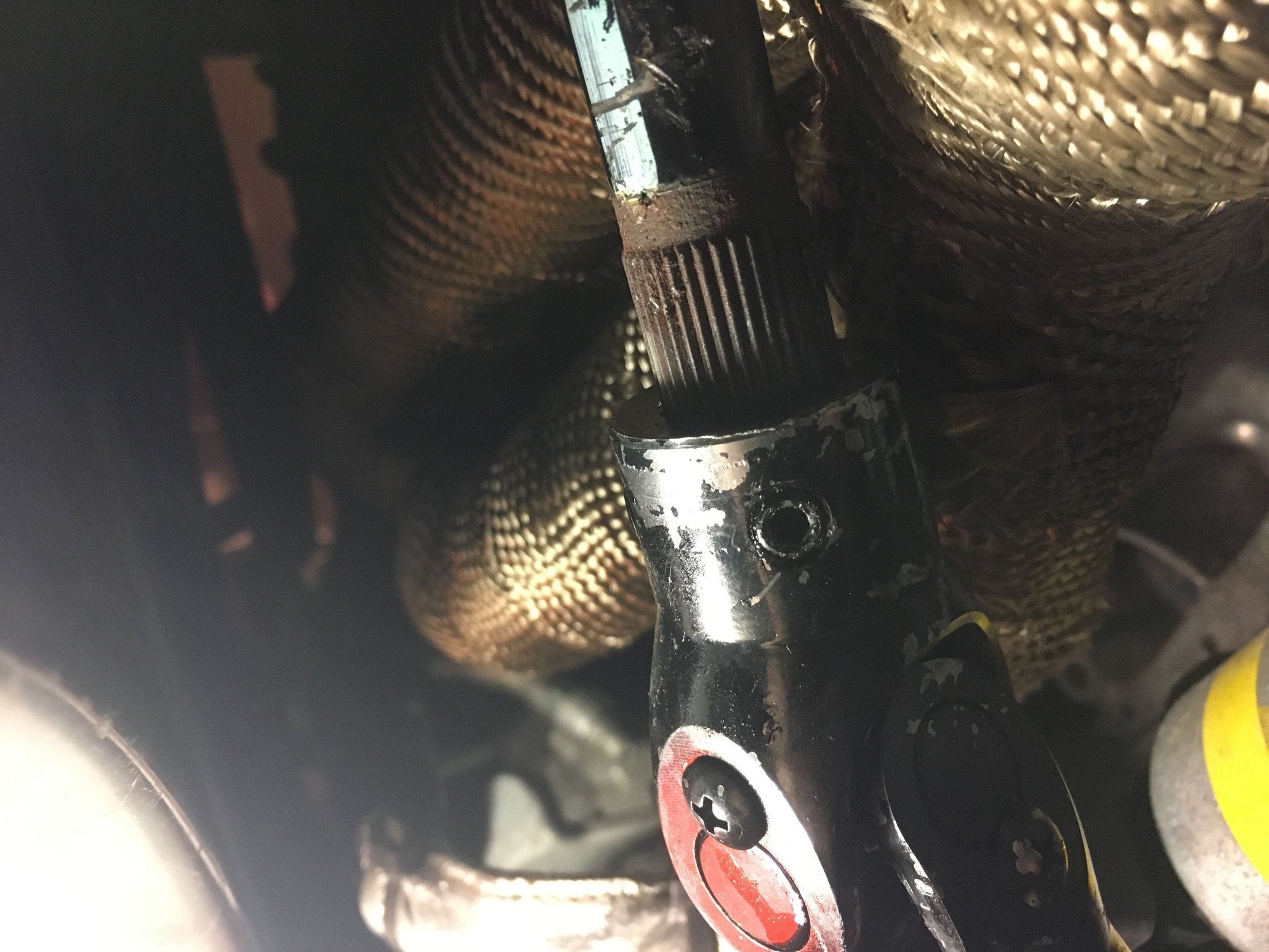 You can see where the header wrap was hitting the OEM joint. I now have ~1/2" space, and nothing that would catch because the new joint is round.