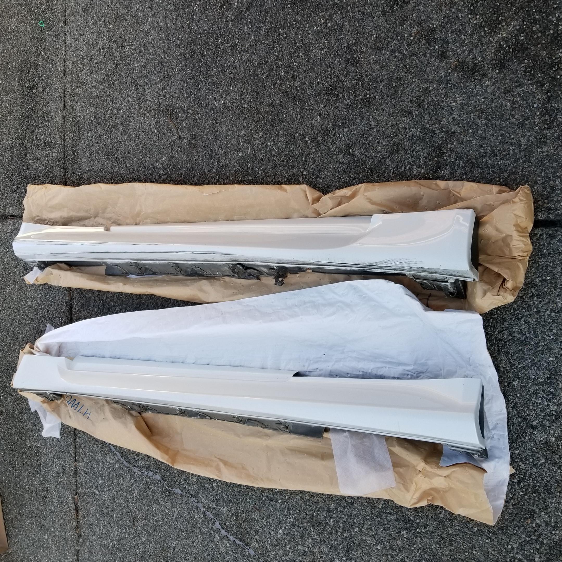 Passenger sideskirt has a paint scuff and one clip is broken.