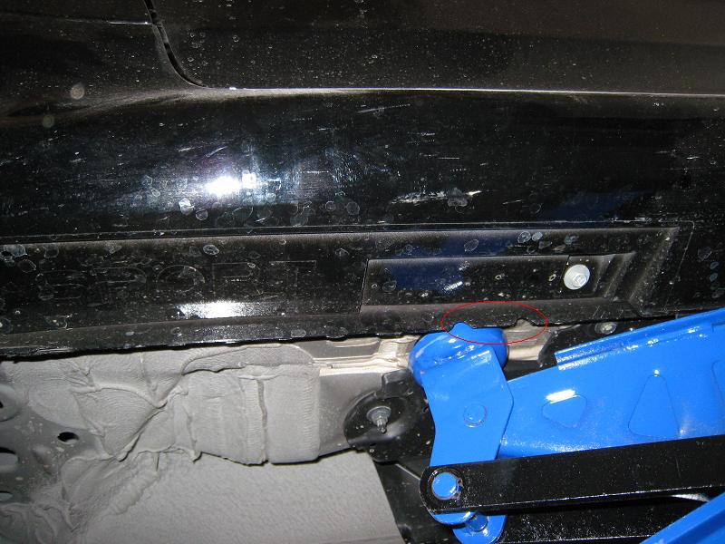 In floorjack3, this is the rear tires. I put the jack slightly behind the notchs and again on the other side of the notch marker itself. There is a metal support with a hole in it that supports the car perfectly. You can't miss it.