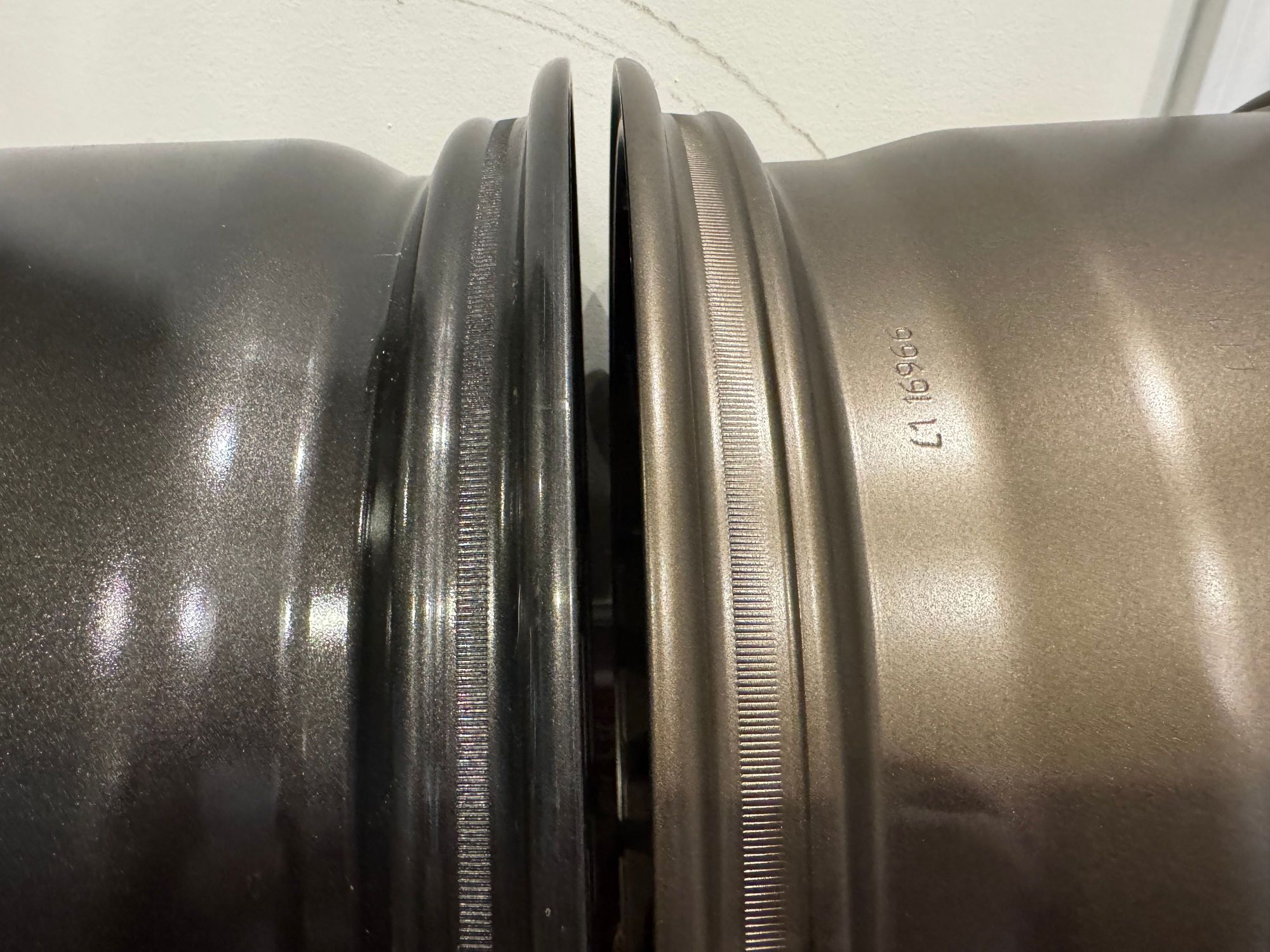 Knurling depth and spacing different. Rim flange shape is different.